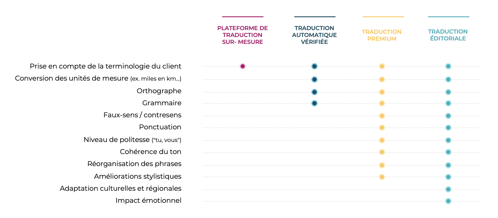 The services provided, which build the ‘quality’ of the translation, and therefore its relative readability, which affects the end user, vary and add up according to the solution implemented.