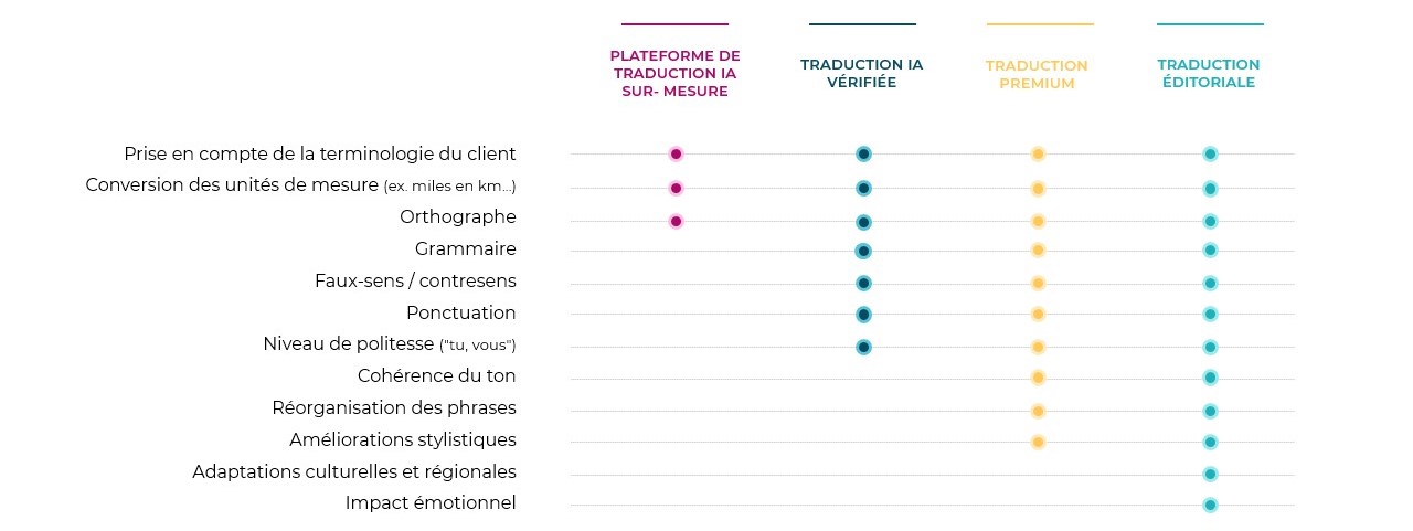 La traduction IA permet la rapidité et les gros volumes, la traduction humaine permet la précision, l’adaptation pour un rendu fluide. Les prestations effectuées, qui construisent la « qualité » de la traduction, et donc sa lecture plus ou moins fluide et impactante par le lecteur final varient et se cumulent suivant la solution mise en œuvre.